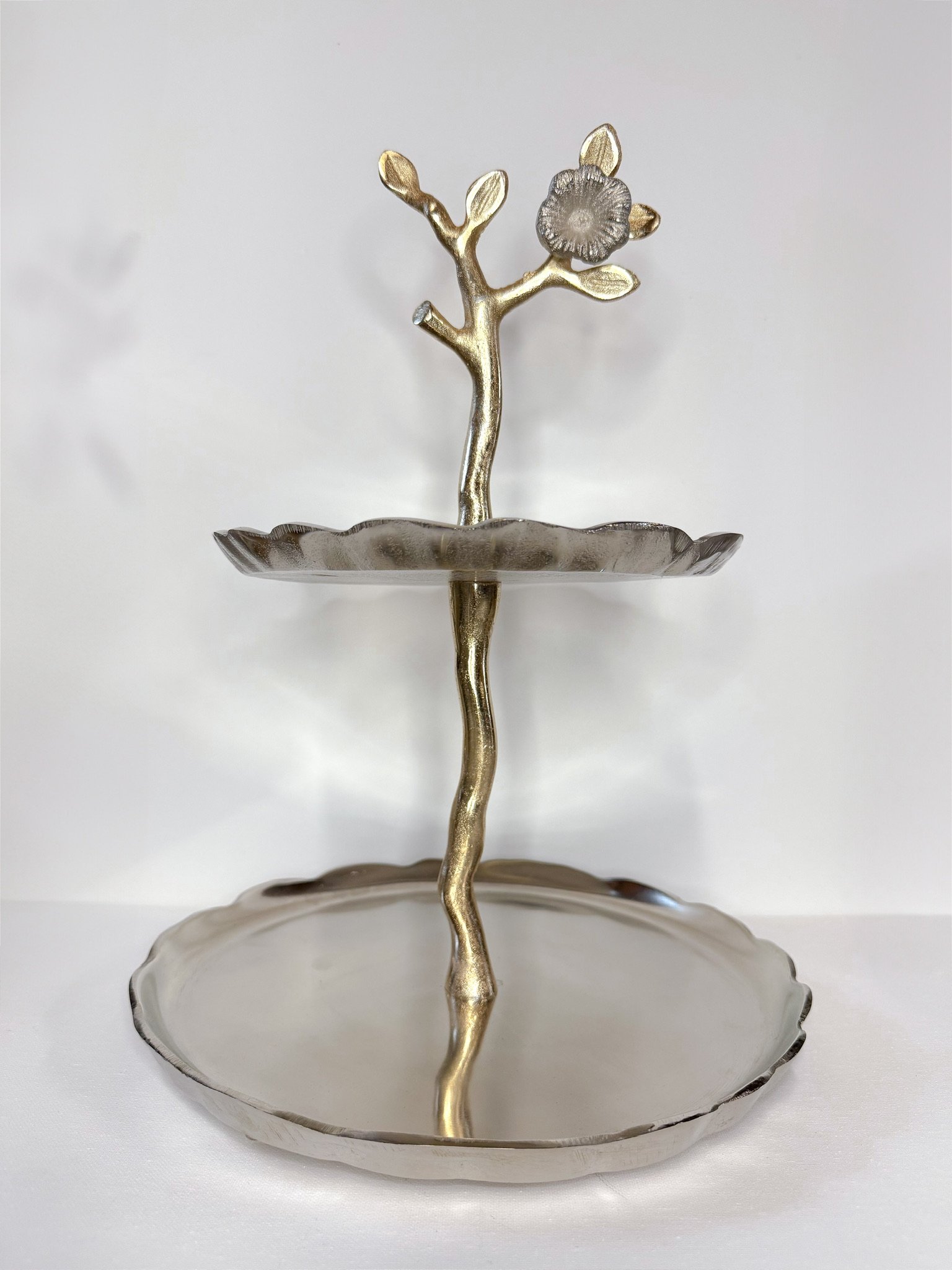 Silver and Gold 2-Tier Dessert Holder–15.5″ H x 11″ W